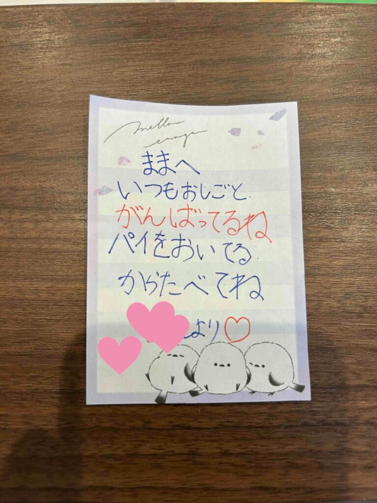 数時間経ち、トラブル対応が終わってリビングに戻ると、夜マックをして帰ってきた家族が、ワタシの大好きな”月見パイ”を買ってテーブルに置いてくれていました。(みんなはお風呂中)その時に一緒に置いてくれていたお手紙。