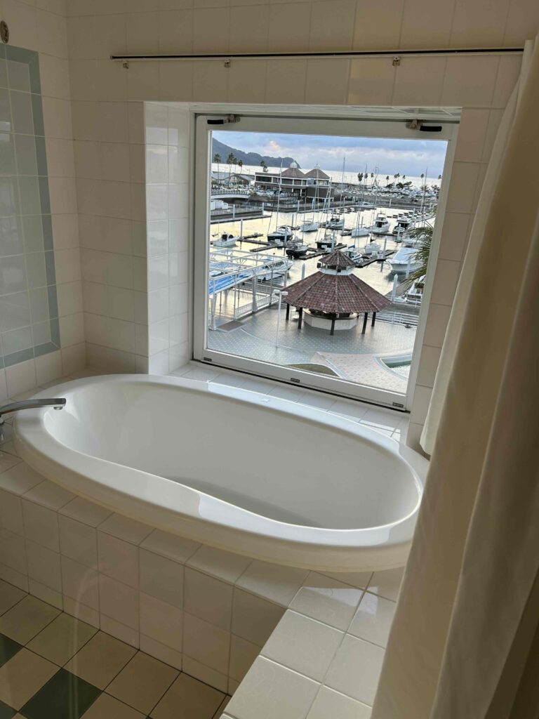 お部屋やお部屋のお風呂からはヨットハーバーの景色が見えて、夕陽の時間帯は特に綺麗でした。