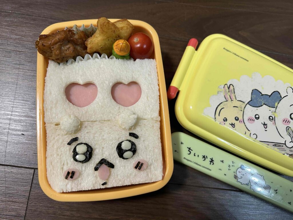 結果、ちぃかわのお弁当むずかしい!細かい!不器用なワタシにはカットも大変だし、顔の中のバランスも難しい。ほんとは口の部分の海苔はもっと丸くしたかったし、もう1つ”ハチワレ”も作りたかったけれど、1時間では作り切れずタイムオーバー。